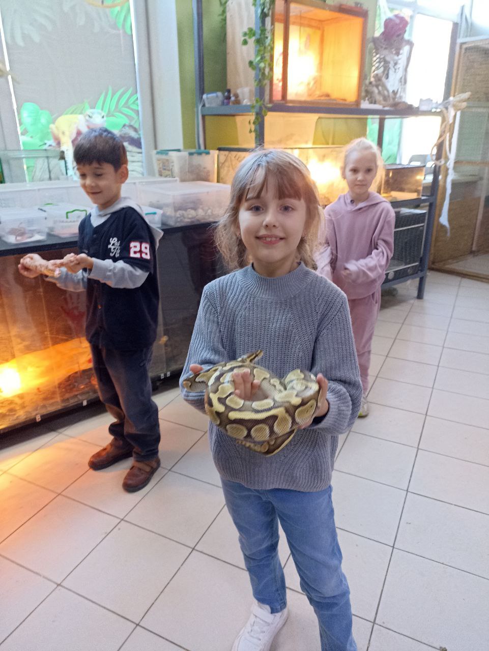 Дети могли общаться с домашними животными — кроликами, лемурами, змеями, обезьянками и другими питомцами. Им рассказали о особенностях каждого животного, важности бережного отношения к природе и животному миру. Дети с удовольствием погладили животных, что способствовало развитию ответственности и эмпатии.
