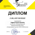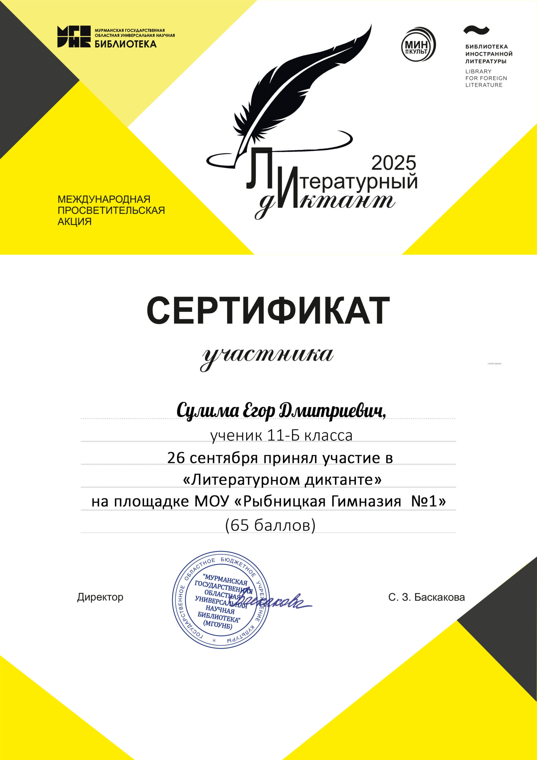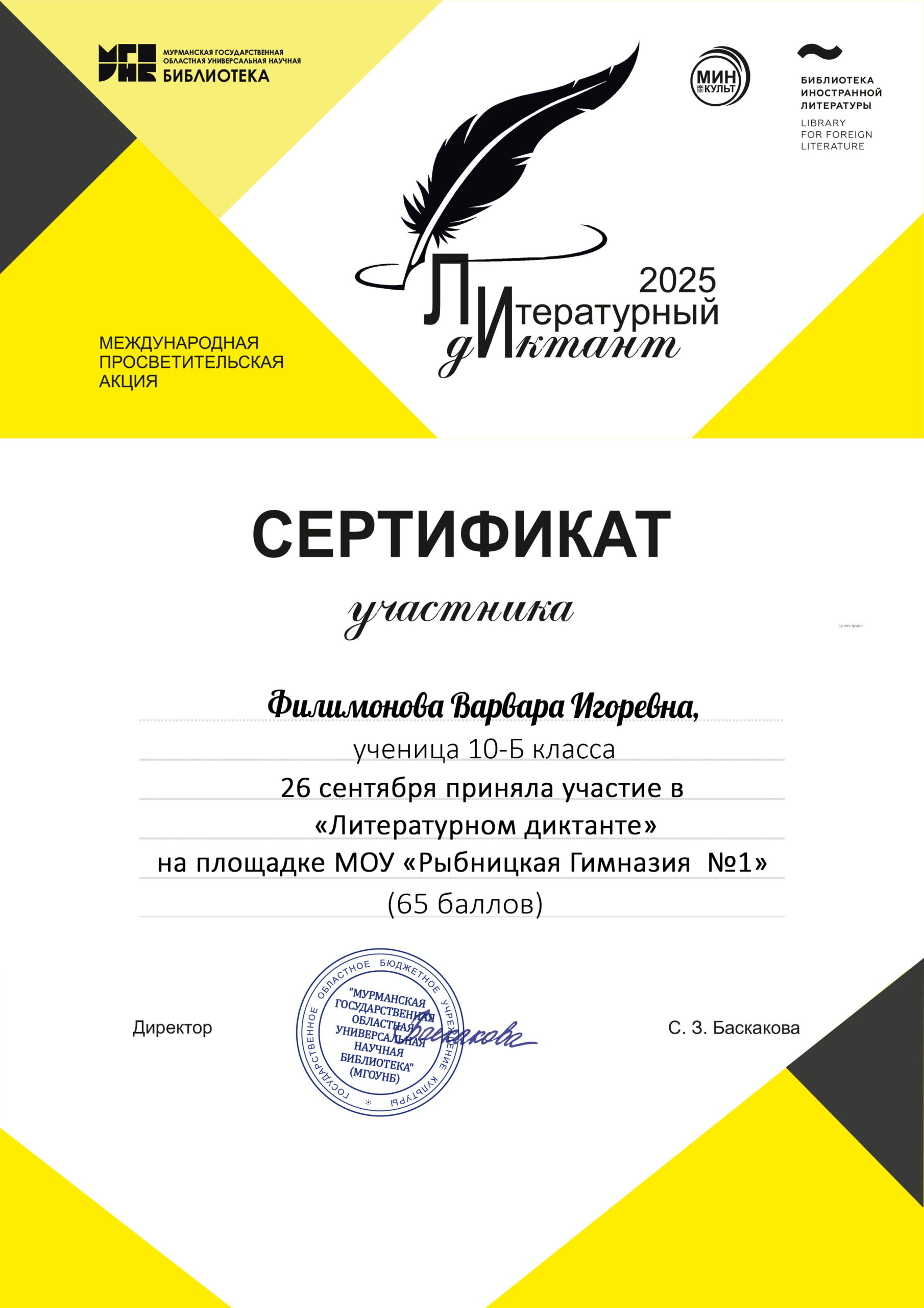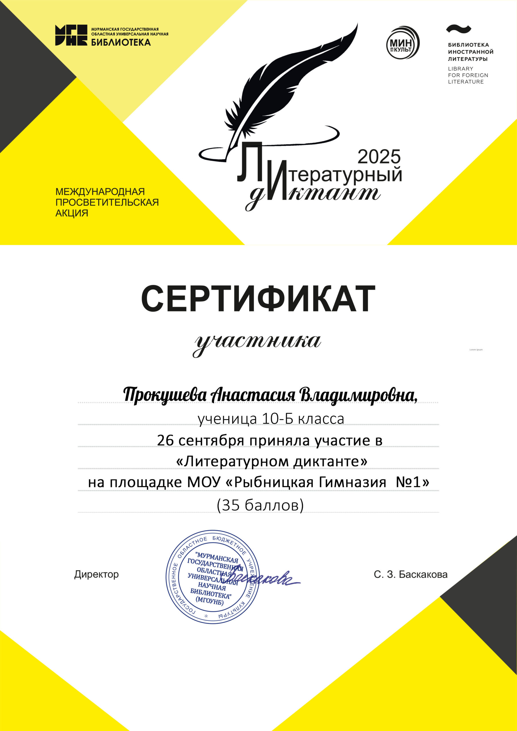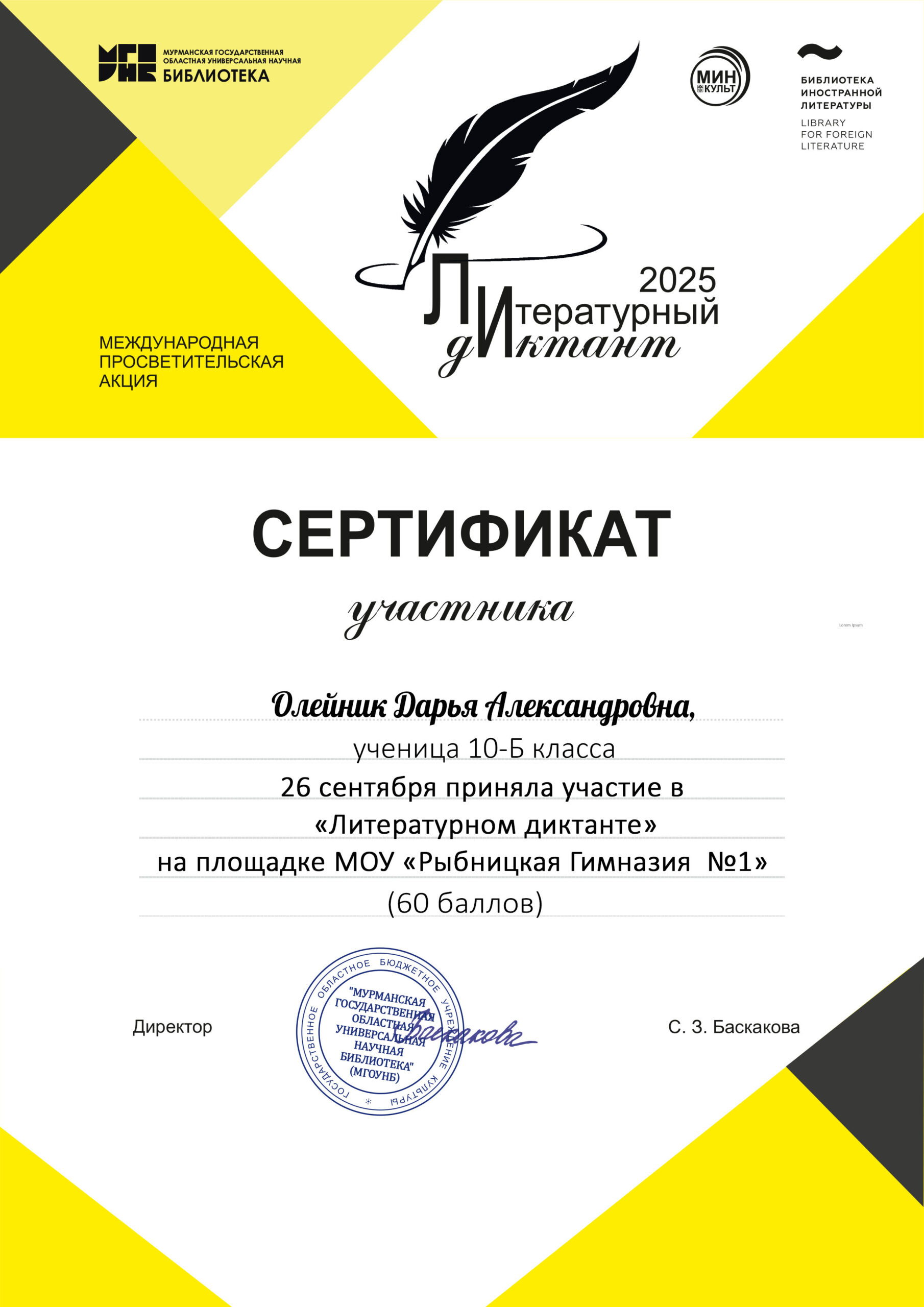 26 сентября 2025 года на базе МОУ «Рыбницкая гимназия №1» была проведена Международная просветительская акция «Литературный диктант» для учащихся 10-11 классов МОУ «Рыбницкая гимназия №1» (17 учащихся ) и МОУ «РТЛ-к» (10 учащихся). Эта Международная просветительская акция проходит по инициативе Мурманской государственной областной универсальной научной библиотеки в партнерстве с Всероссийской библиотекой иностранной литературы имени Маргариты Ивановны Рудомино при поддержке Федерального агентства по делам Содружества Независимых Государств, соотечественников, проживающих за рубежом, и по международному гуманитарному сотрудничеству, а также при поддержке Министерства культуры Мурманской области. В 2025 году по всему миру работают более 1400 площадок «Литературного диктанта». Сегодня любители чтения более чем 25 стран объединились, чтобы узнать, насколько хорошо они помнят произведения классической русской литературы.